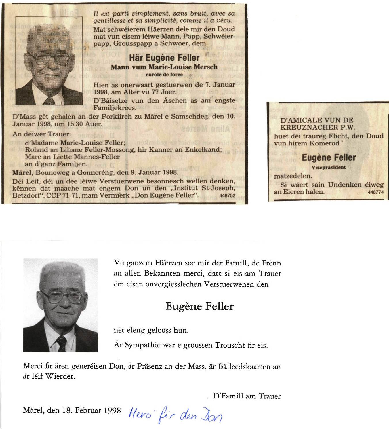 Divers Feller Eugène 13041920 Luxemburg 07011998.jpg Télécharger le document Feller Eugène 13041920 Luxembourg Feller Eugène 13041920 Luxembourg.jpg Télécharger le document Namensliste mit Geburtstag.jpg Télécharger le document