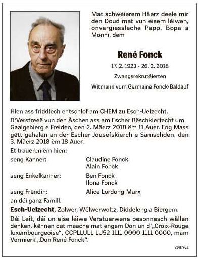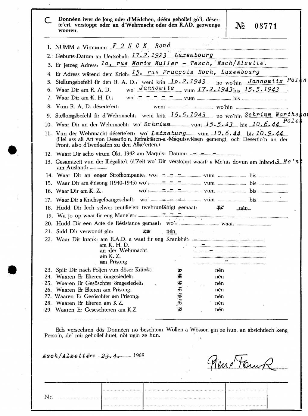 FONCK Rene 17021923 Luxembourg 1.jpg Télécharger le document 2.jpg Télécharger le document 3.jpg Télécharger le document 5_Fonck_René_17021923.jpg Télécharger le document Fonck_René_17021923_Lux_Fiche_Ons_Jongen_1946_Archive_HOLLERICH_mars_2018.pdf Télécharger le document