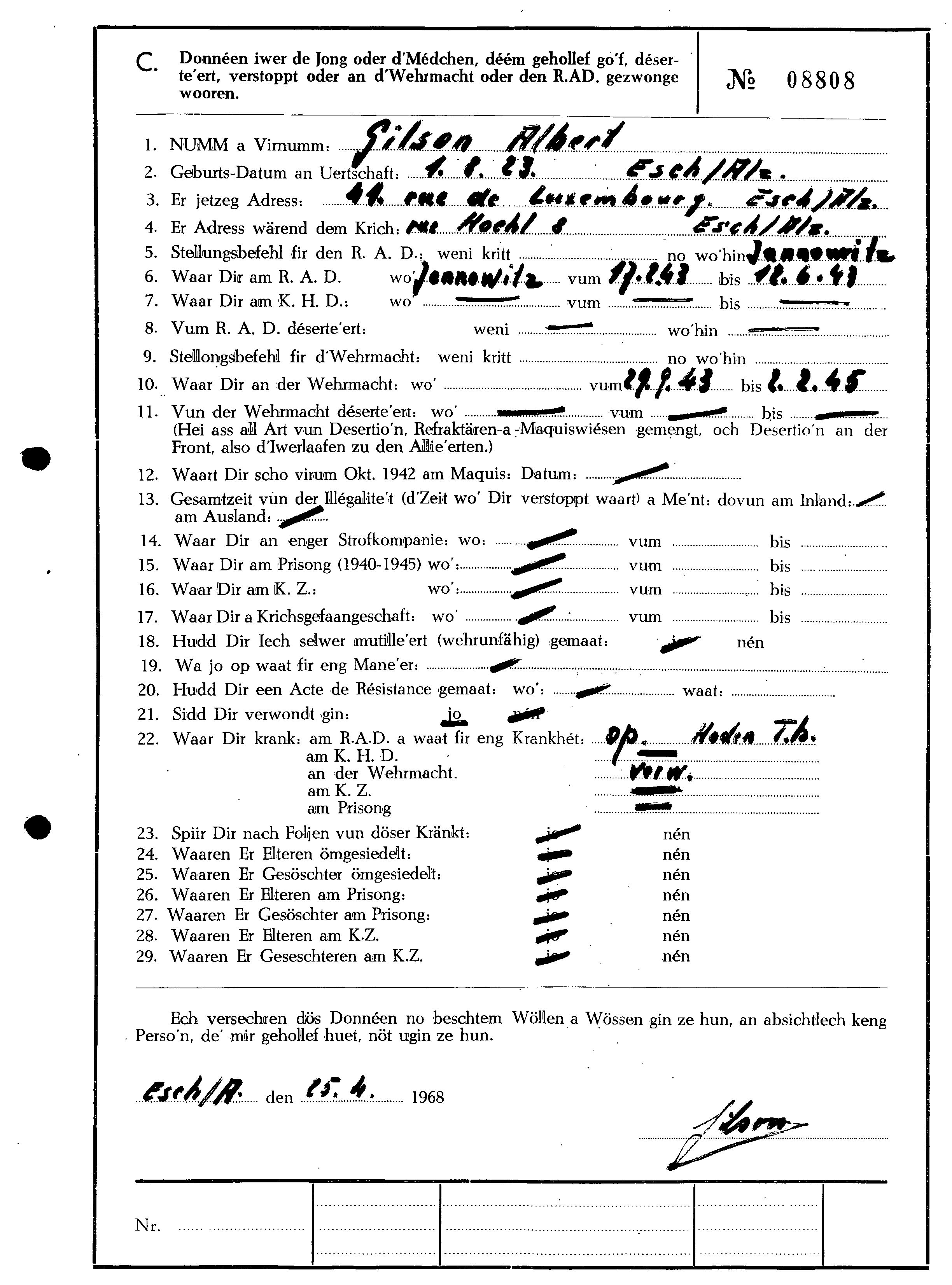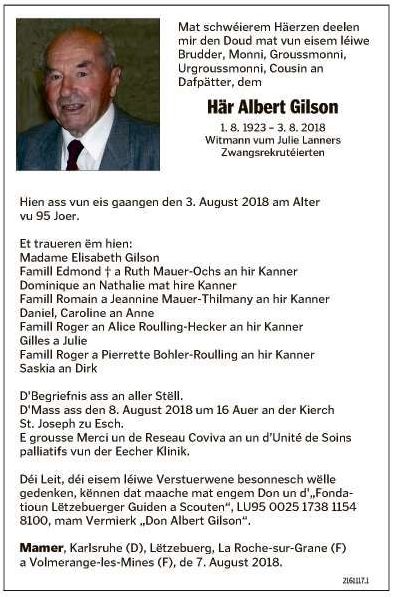 GILSON Albert 01081923 Esch sur Alzette 1.jpg Télécharger le document 2.jpg Télécharger le document 3.jpg Télécharger le document RIP_Gilson_Albert_01081923_LW_07082018 22_Gilson_Albert_01081923_03082018.jpg Télécharger le document