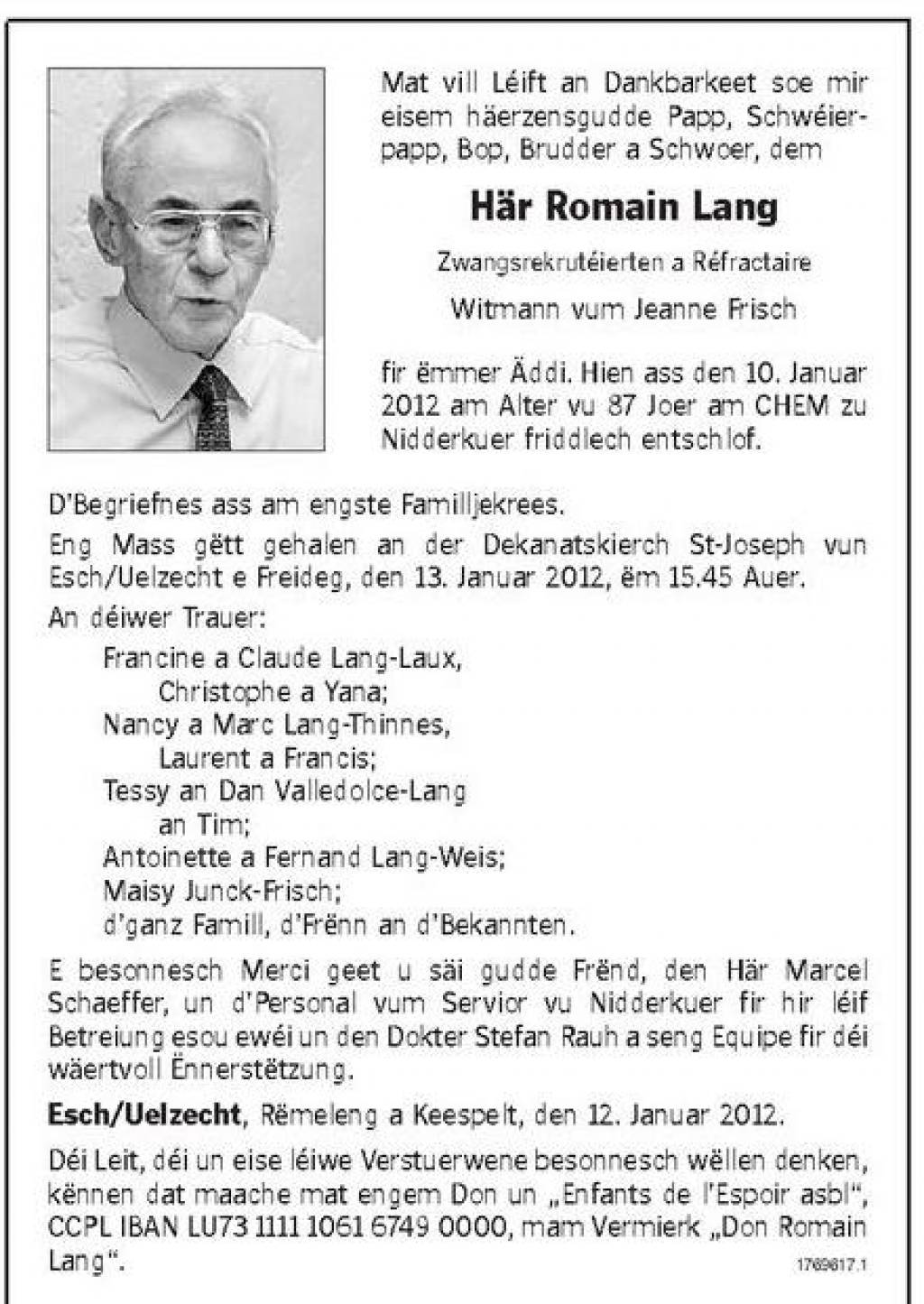 Divers Lang Romain_27111924_Niedercorn.jpg Télécharger le document LANG Romain 27111924 Niedercorn 1.jpg Télécharger le document 2.jpg Télécharger le document 3.jpg Télécharger le document 4.jpg Télécharger le document