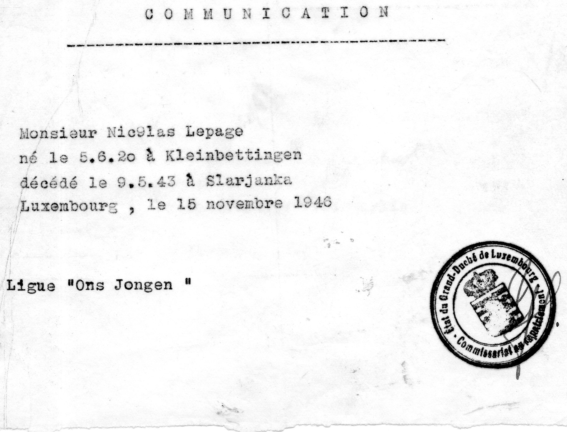 Divers_Lepage Img0902.jpg Télécharger le document img337.jpg Télécharger le document Lepage_Nicolas_05061920_Kleinbettingen_09051943_Slarjanka_Archives_HOLLERICH_mai_2018.jpg Télécharger le document Lepage Nicolas STESEL Lepage Nicolas.JPG Télécharger le document Lepage Nikela.jpg Télécharger le document