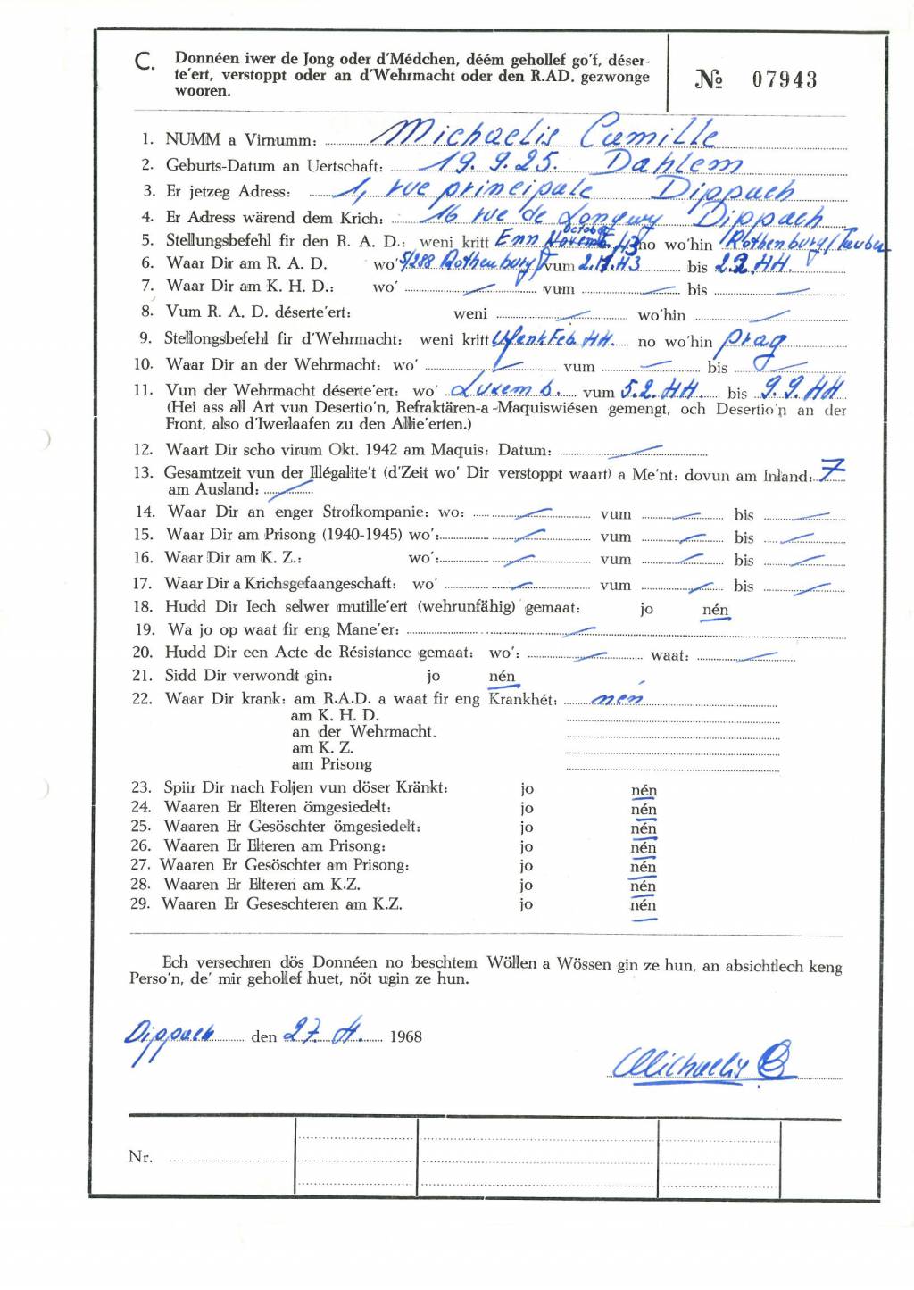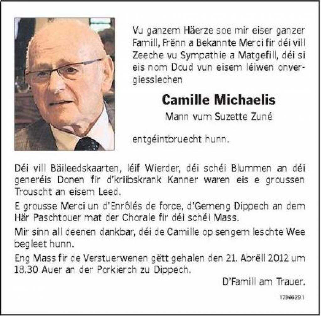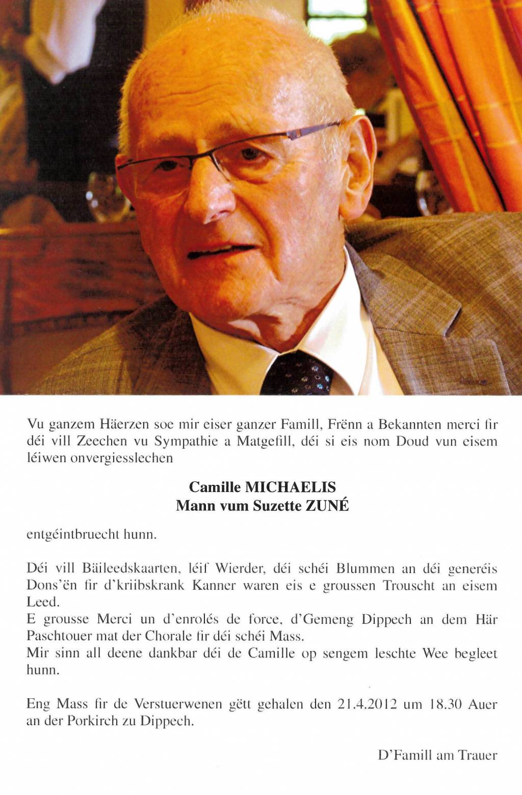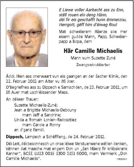 Michaelis Camille 19091925 Dalheim 1.jpg Télécharger le document 2.jpg Télécharger le document Todesanzeige Lux Reseaux Maquis 2006.jpg Télécharger le document Michaelis Camille 1.jpg Télécharger le document Michaelis Camille 19091925.jpg Télécharger le document Michaelis Camille.jpg Télécharger le document