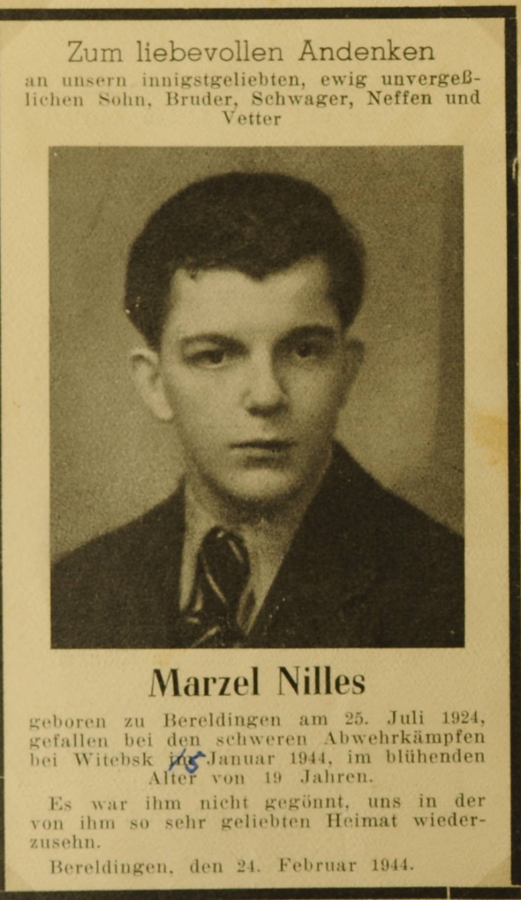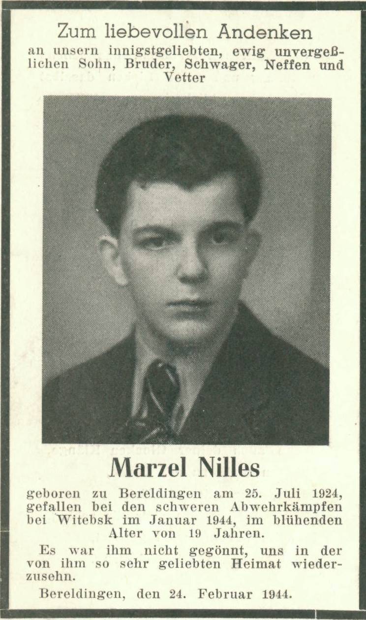 Divers Img1586.jpg Télécharger le document Nilles Marzel.JPG Télécharger le document Nilles_Marcel_25071924_Bereldingen_Januar_1944_Wtebsk_Russland.jpg Télécharger le document Walfer.pdf Télécharger le document VDL P1050102.JPG Télécharger le document P1050103.JPG Télécharger le document