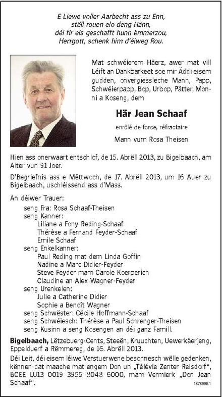 LW Schaaf Jean 01091921 Bigelbach 15.04.2013.jpg Télécharger le document SCHAAF Jean 01091921 Bigelbach 1.jpg Télécharger le document 2.jpg Télécharger le document 3.jpg Télécharger le document