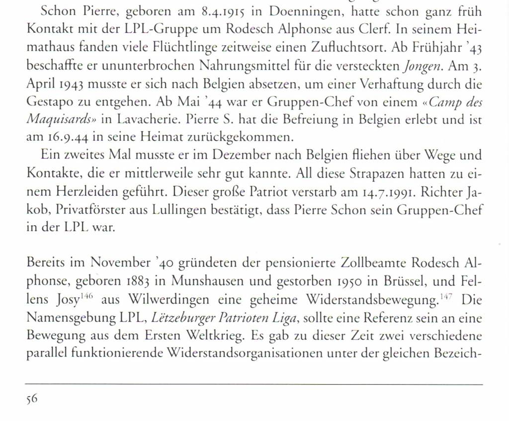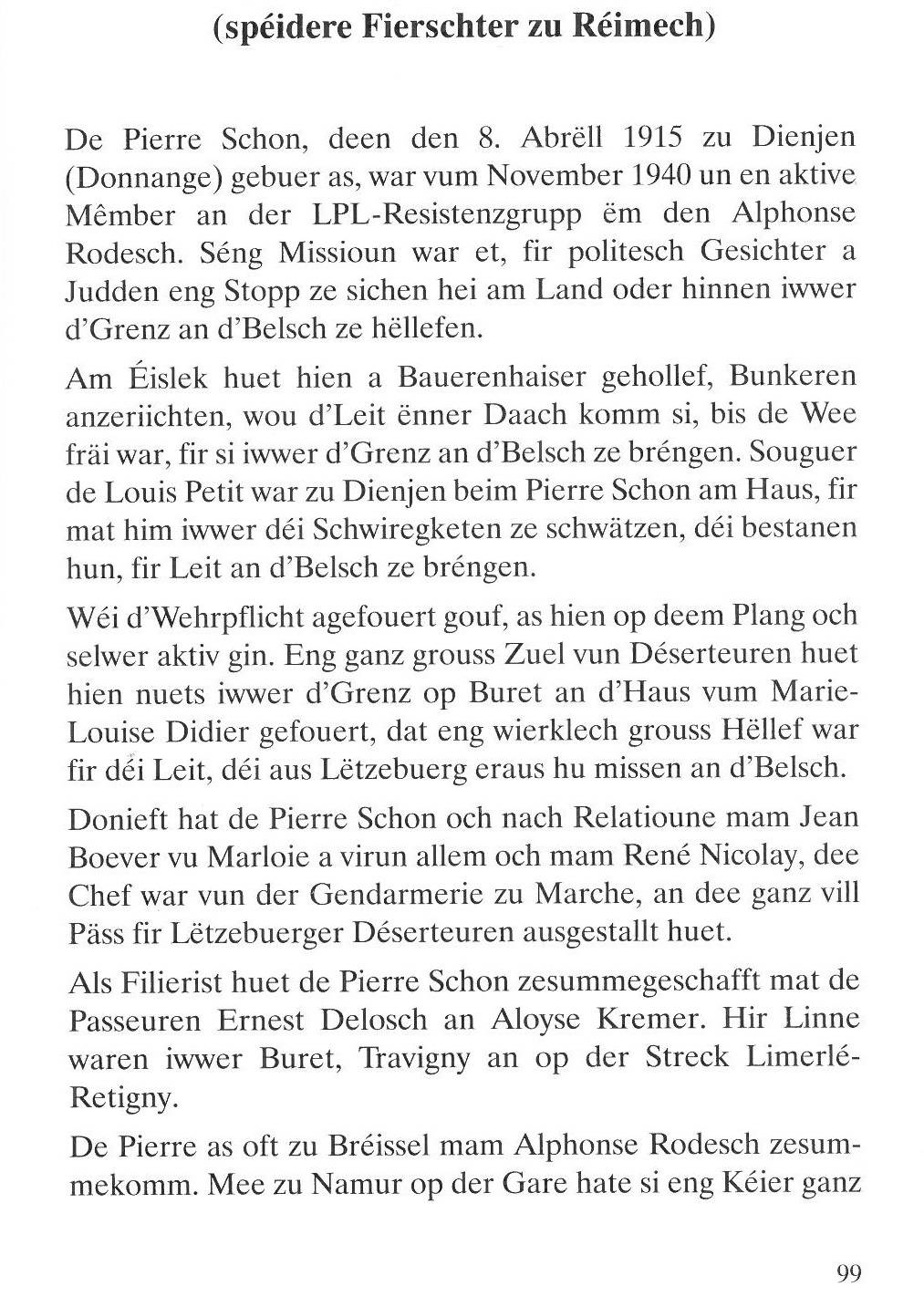 Schon_Pierre_08041915_Doennange Schon_Pierre_08041915_Doenange_14071991_FIRWAT_ERNY_J_LAMBORELLE_2014.jpg Télécharger le document Schon_Pierre_08041915_Donnange_Extrait_Livre_Resistenz_Musel_Erennerungen_un_Krichsjoren_1940-45_UNION_MUSEL_1997.jpg Télécharger le document