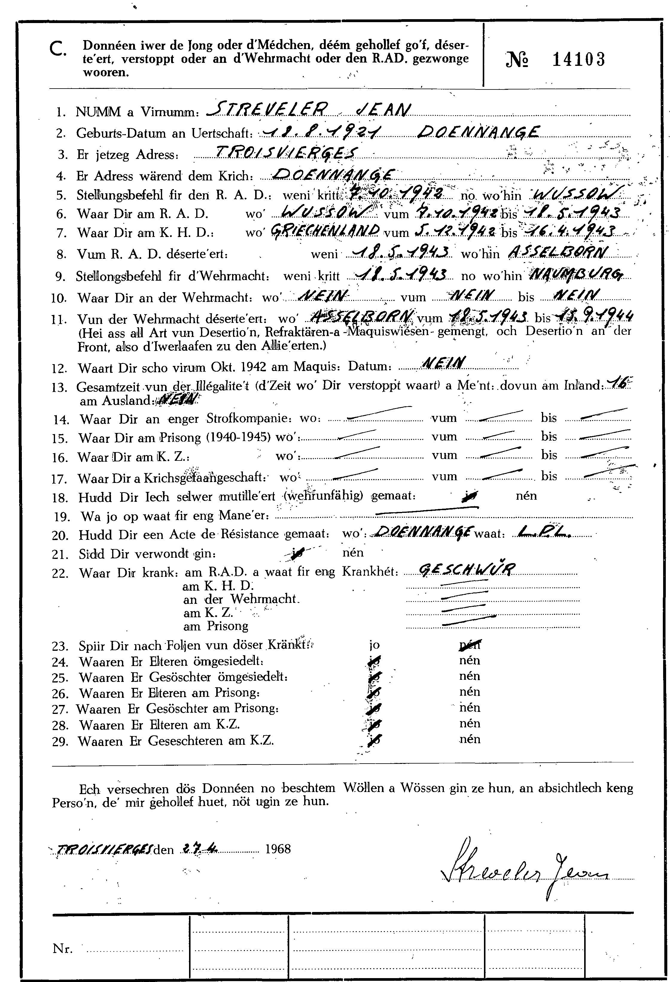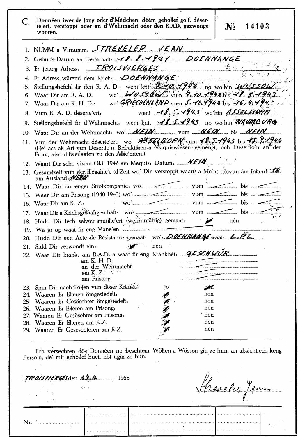 Divers Streveler Jean 18081921 Doennange.pdf Télécharger le document Streveler jean 18081921 Doenningen KERGEN Kriegserinnerungen eines Oslinger Resistenzler.JPG Télécharger le document MRN 1.jpg Télécharger le document 2.jpg Télécharger le document 3.jpg Télécharger le document