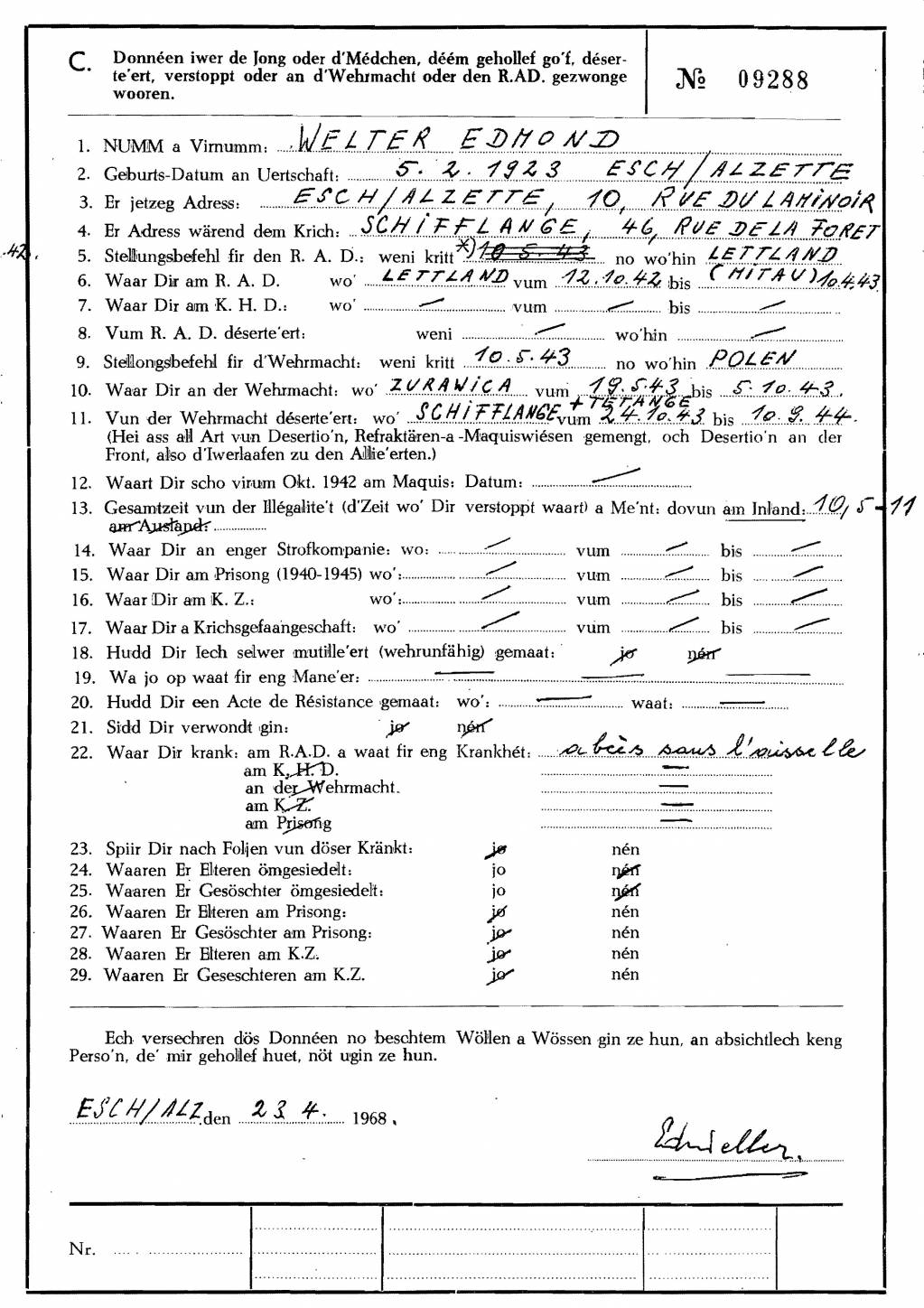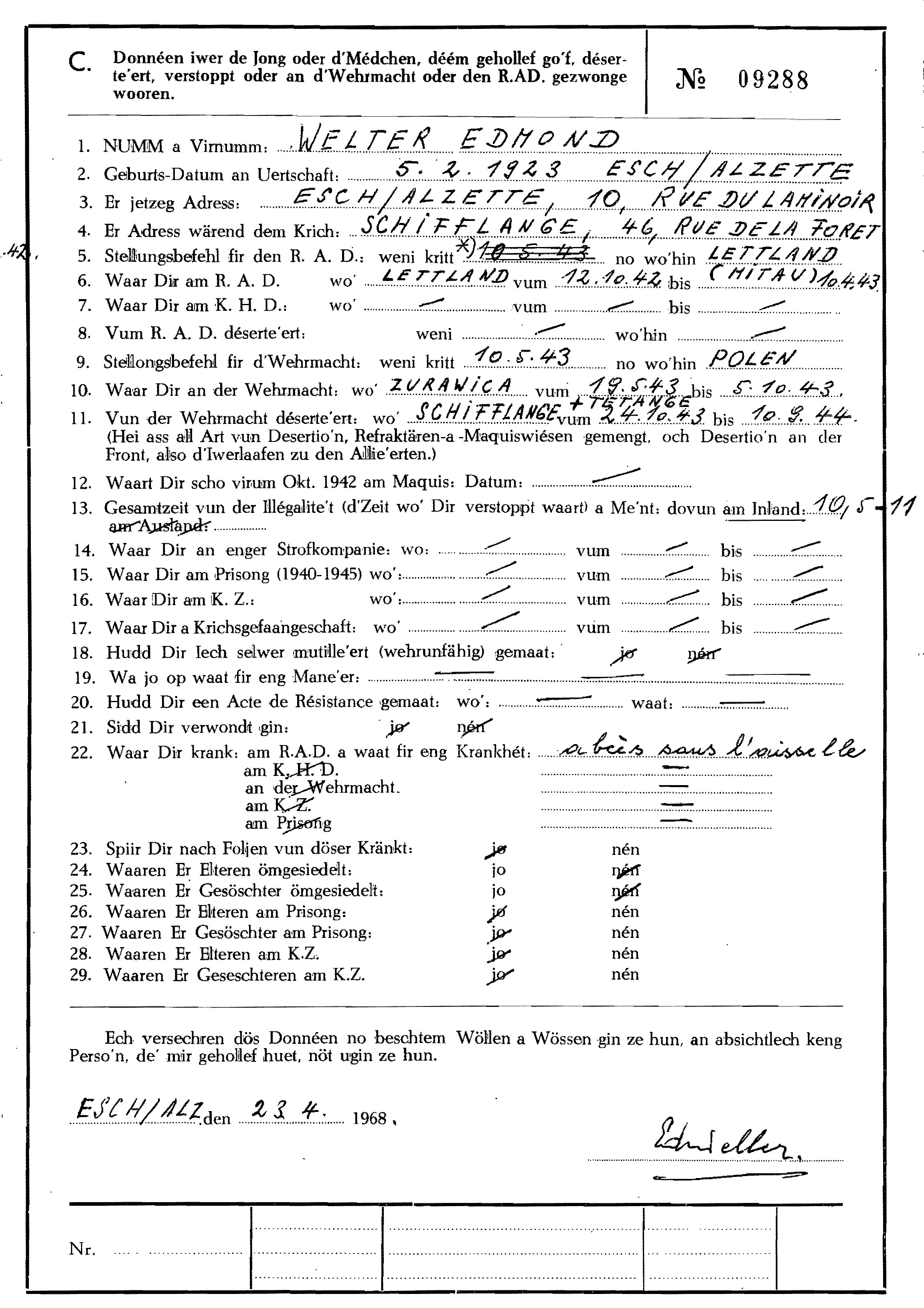 Welter Edmond Welter Edmond.jpg Télécharger le document Welter Edmond1.jpg Télécharger le document WELTER Edmond 05021923 Esch sur Alzette 1.jpg Télécharger le document 2.jpg Télécharger le document 3.jpg Télécharger le document