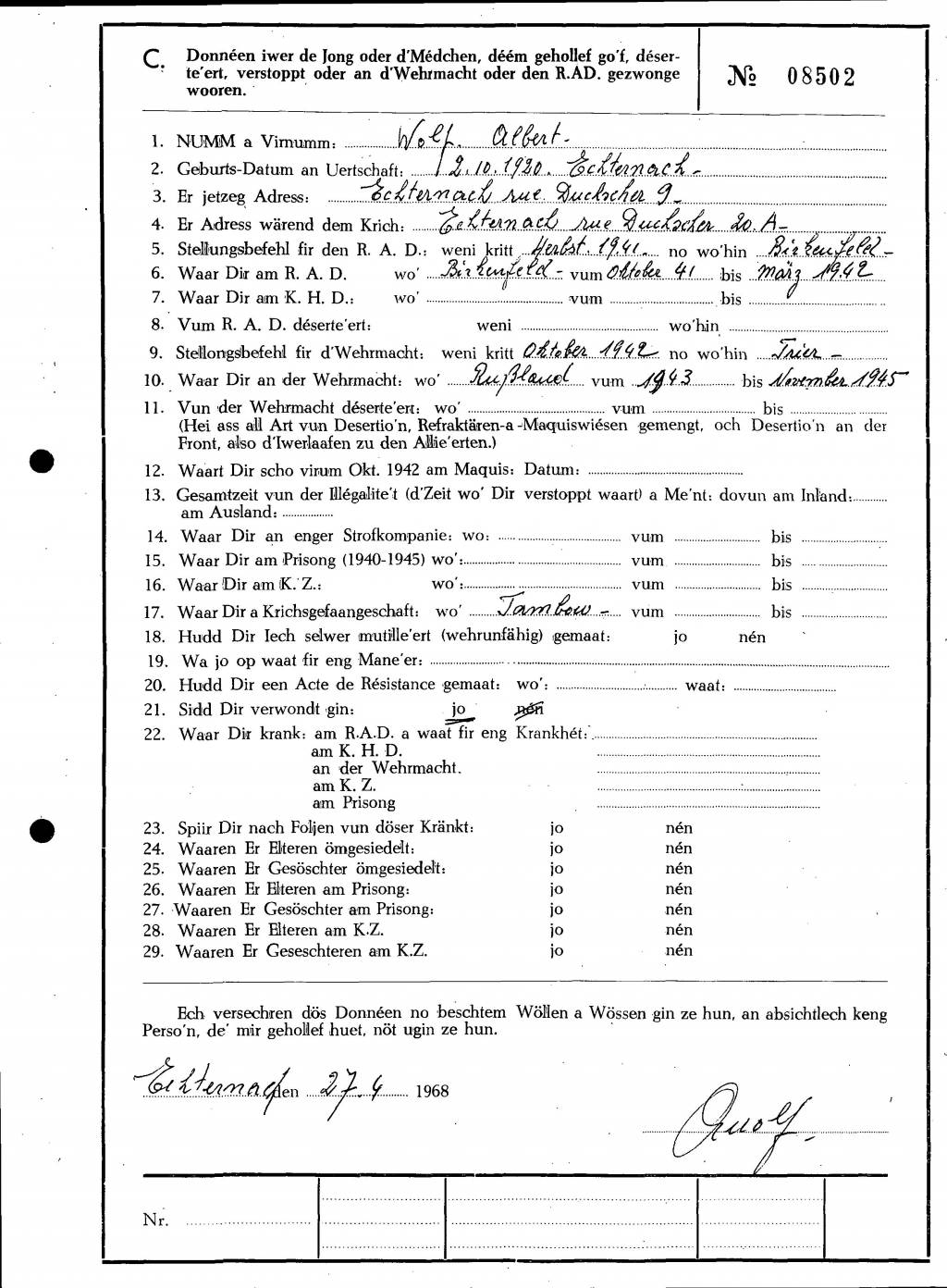 WOLF Albert 02101920 Echternach 1.jpg Télécharger le document 2.jpg Télécharger le document 3.jpg Télécharger le document Wahl_Martin_extrait_article_Bley_Franois_4_Extrait_Livre_Schicksalswege_einer_Kriegsgeneration_GREG_Ettelbruck_2_EG_2017 - Copy.jpg Télécharger le document