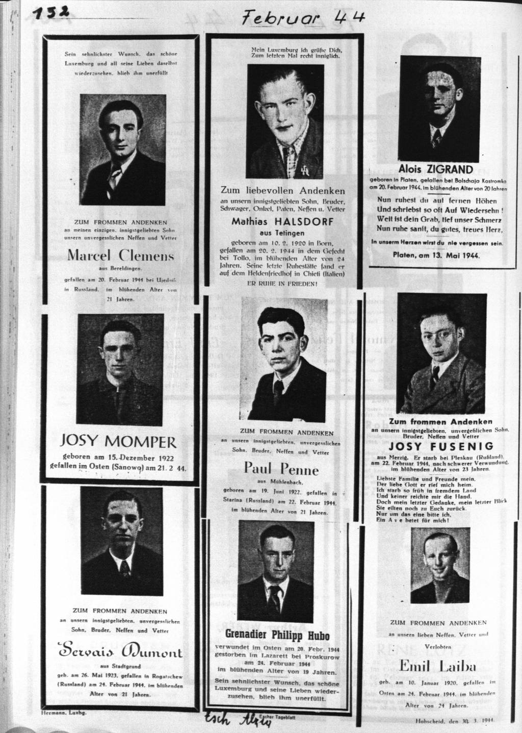 Divers Fritz RASQUE.jpg Télécharger le document Img1565.jpg Télécharger le document img309.jpg Télécharger le document img423.jpg Télécharger le document Krichjoeren 1940-1945 zu Letzebuerg.jpg Télécharger le document Zigrand Alois.JPG Télécharger le document Feldpostnummer ev Zigrand.jpg Télécharger le document img355.jpg Télécharger le document img357.jpg Télécharger le document img362.jpg Télécharger le document